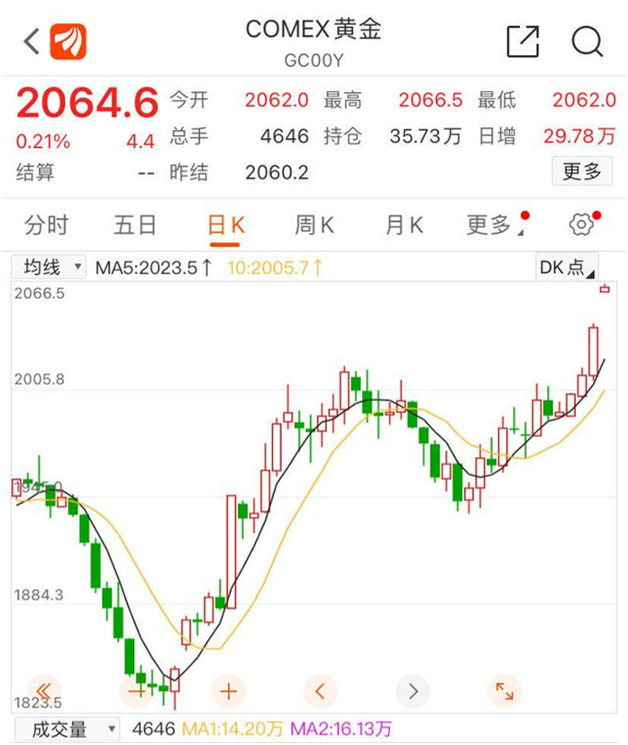 繼上周五國際金價突破2000美元關(guān)口后,11月29日紐約商品交易所COMEX12月黃金期貨持續(xù)收漲,截止29日八點(diǎn),該指數(shù)暫報(bào)2064.7美元,連漲四日且創(chuàng)5月中旬以來的半年新高,也越來越逼近2080美元的歷史最高。