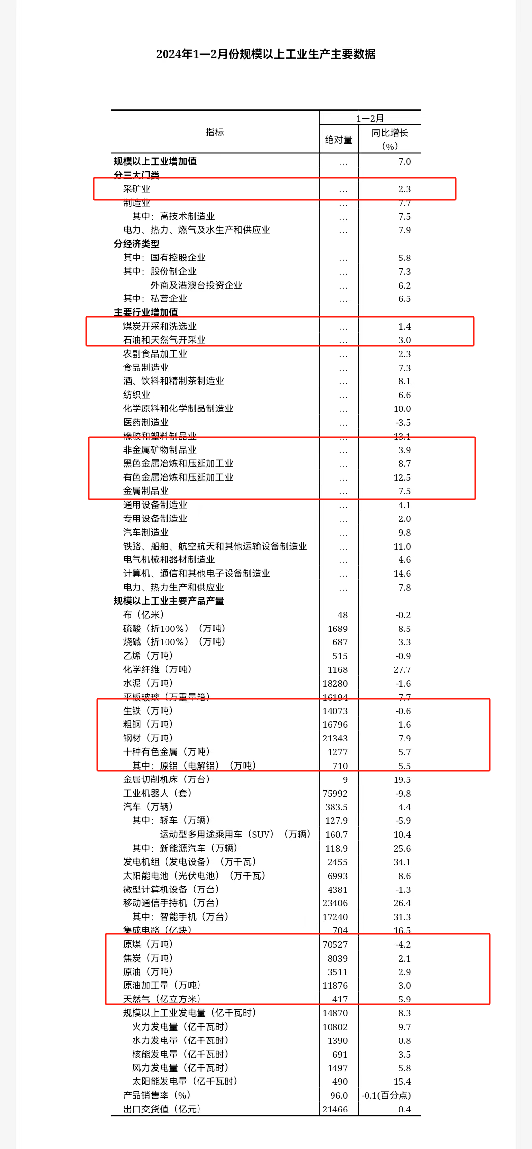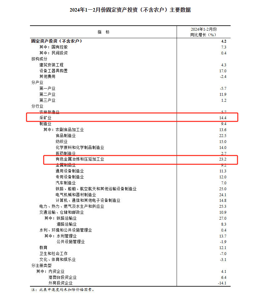 分行業(yè)看,1—2月份,41個(gè)大類行業(yè)中有39個(gè)行業(yè)增加值保持同比增長。其中,涉礦主要行業(yè)利潤情況如下:煤炭開采和洗選業(yè)增長1.4%,石油和天然氣開采業(yè)增長3.0%,金屬礦物制品業(yè)增長3.9%,黑色金屬冶煉和壓延加工業(yè)增長8.7%,有色金屬冶煉和壓延加工業(yè)增長12.5%。