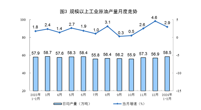 原油生產(chǎn)穩(wěn)定增長,進(jìn)口增速加快。1—2月份,規(guī)上工業(yè)原油產(chǎn)量3511萬噸,同比增長2.9%。進(jìn)口原油8831萬噸,同比增長5.1%,增速比上年12月份加快4.5個(gè)百分點(diǎn)。