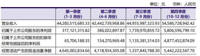 年報數據顯示,2023年,公司實現營業收入1862.69億元,同比增長7.68%;實現歸屬于母公司凈利潤82.50億元,同比增長36%,雙雙創下歷史新高。其中,第四季度實現盈利58.07億元,同比增長257.89%,創下有史以來單季度盈利新高。
