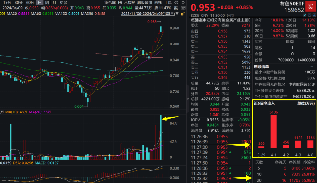 4月8日,有色50ETF(159652)標(biāo)的指數(shù)單日成交額達(dá)1億元,刷新自2023年2月上市第二日以來最高單日成交額紀(jì)錄!資料顯示,其為全市場(chǎng)銅含量最高的有色指數(shù),其“含銅量”達(dá)26.06%。