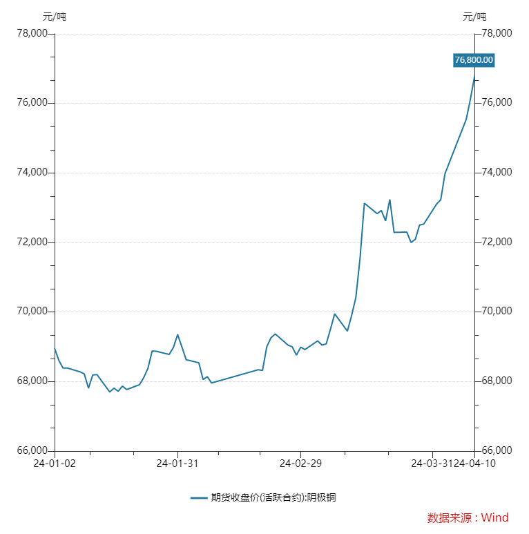 今年以來銅價(jià)持續(xù)震蕩上行。具體來看,國(guó)內(nèi)方面,wind數(shù)據(jù)顯示,截至4月10日下午收盤,滬銅主連報(bào)76800元/噸,較上個(gè)交易日上漲0.66%,1月至今,銅價(jià)持續(xù)攀升,較年初上漲7840元/噸,漲幅達(dá)11.4%。國(guó)際方面,截至2024年4月8日收盤,LME銅報(bào)9443美元/噸,國(guó)內(nèi)國(guó)外分別創(chuàng)下近兩年和近一年的價(jià)格新高。
