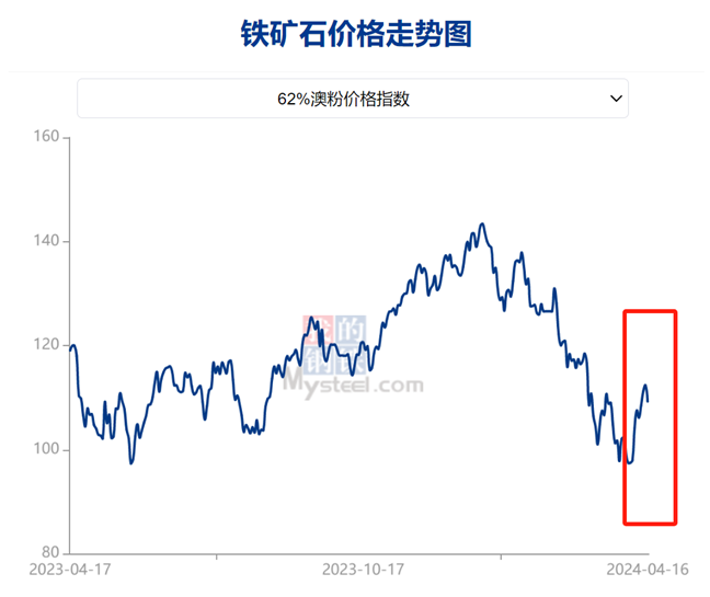 自清明節后,鐵礦石價格表現強勁。截止4月16日,Mysteel鐵礦石62%澳粉指數為109.25美元/干噸,雖然下跌3.1美元/干噸,但仍較節前最后一個工作日上漲9.9美元/干噸,漲幅為9.96%。市場情緒明顯好轉,鐵礦石價格反彈,漲幅超大家預期,鐵礦石的春天是否到來了?