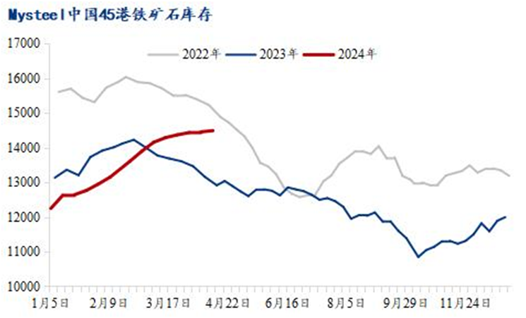 港口庫存方面,4月15日,中國45港進口鐵礦石庫存總量14656.54萬噸,環比上周一增加190萬噸,47港庫存總量15296.54萬噸,環比增加245萬噸。目前累庫有所放緩,五一節前鋼廠補庫力度,廠內庫存或小幅增加,后續在疏港增加之下,港口庫存或逐步迎來庫存拐點,但4月份仍難降庫。