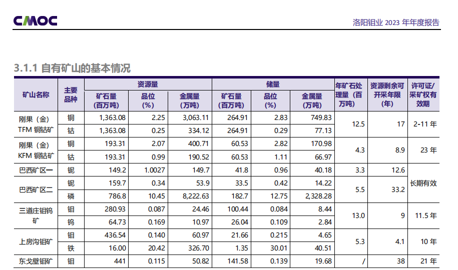 根據洛陽鉬業2023年年報,公司擁有多個優質礦山資源。其中,國內三座,分別是上房溝鉬礦、三道莊鉬礦和東戈壁鉬礦。此外,公司在海外還有四座礦山。除了剛果(金)的TFM和KFM兩座礦山外,還有巴西的鈮礦和磷礦。其中,TFM是全球最大的銅鈷礦之一,KFM是全球第一大鈷礦,巴西鈮礦是世界第二大鈮礦。