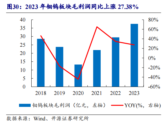 鉬鎢板塊方面,開源證券研報顯示,去年,洛陽鉬業全年鉬鎢產量合計2.36萬噸,營收為86.11億元,同比增長23.63%,毛利為37.51億元,創歷史最高紀錄。