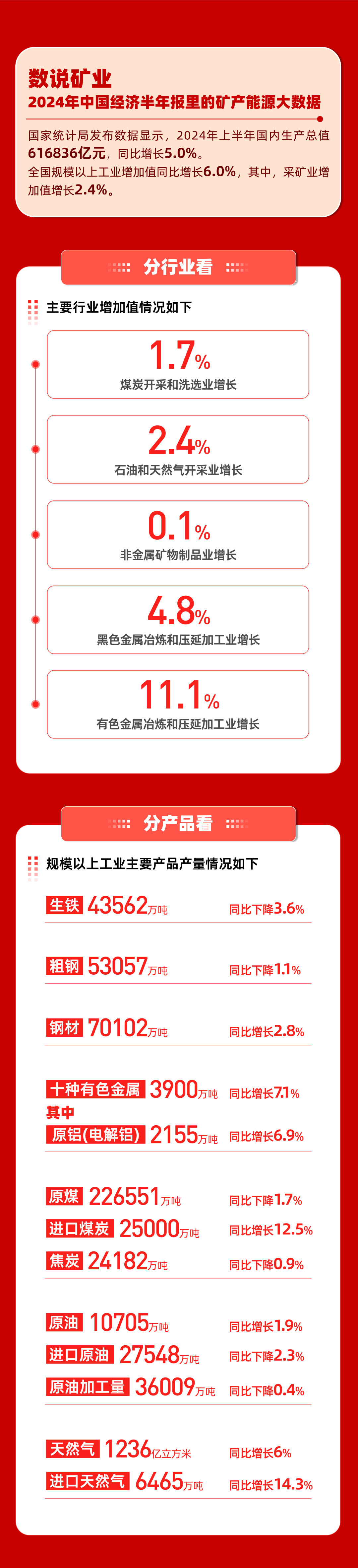 7月15日,國(guó)家統(tǒng)計(jì)局公布2024年經(jīng)濟(jì)半年報(bào)。2024年上半年國(guó)民經(jīng)濟(jì)運(yùn)行總體平穩(wěn),國(guó)內(nèi)生產(chǎn)總值超60萬(wàn)億元,同比增長(zhǎng)5%。全國(guó)規(guī)模以上工業(yè)增加值同比增長(zhǎng)6%,其中,采礦業(yè)增加值增長(zhǎng)2.4%。