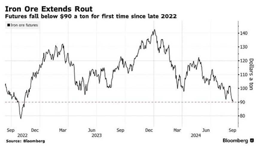 9月9日,新加坡鐵礦石期貨價格周一亞洲時段早盤跌幅一度高達2.3%,至每噸89.60美元,自2022年11月以來首次跌破了90美元大關,為22個月以來最低水平。國內青島港的鐵礦石價格也跌至90美元/干噸左右。昔日被業內譽為“瘋狂的石頭”的鐵礦石,如今正在以罕見的速度向下墜落。