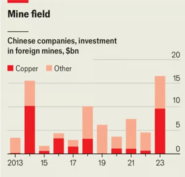 在具體礦產(chǎn)投資上,中國公司也非常具有戰(zhàn)略性。《經(jīng)濟(jì)學(xué)人》稱,隨著中國在電池、電動汽車和太陽能電池板等產(chǎn)品上越來越具有競爭力,中國對海外礦業(yè)的投資也越來越多。銅礦是電氣化的重要材料,去年中國企業(yè)對這種這礦產(chǎn)的投資約占其海外礦產(chǎn)投資的3/5。